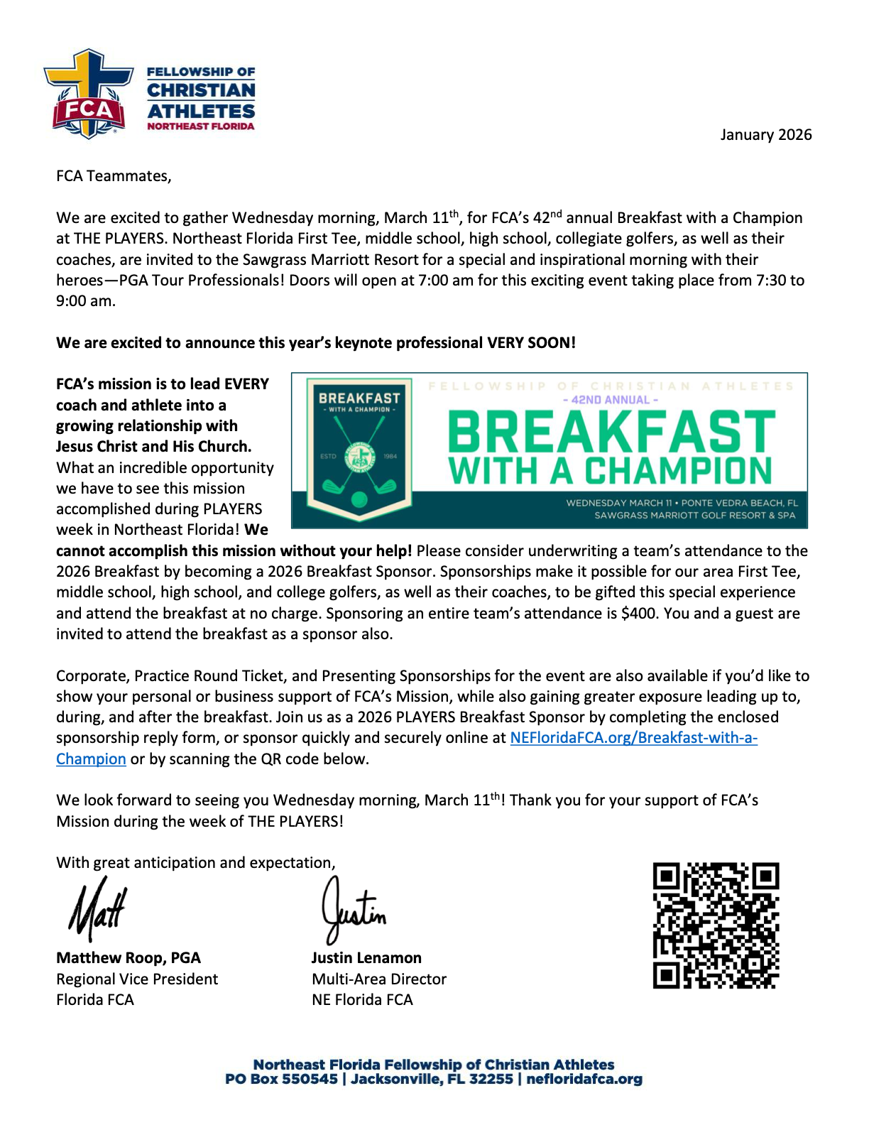 Corporate Sponsorships also also available, including special recognition to you/your business leading up to, during, and after the Breakfast event.